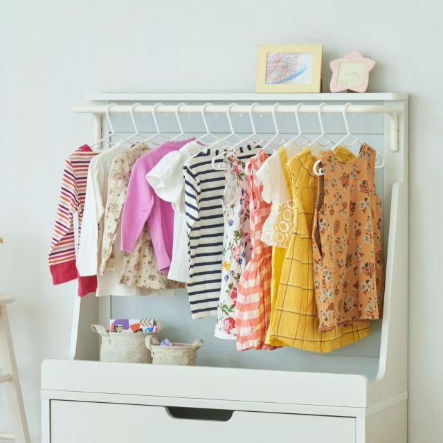 お店のディスプレイのような見栄えで、子ども用の服をかけられるラックです。下のチェストにズボンや下着などを収納するのもおすすめ。120サイズの洋服までかけられる仕様なので、長く使えるのもポイントです。